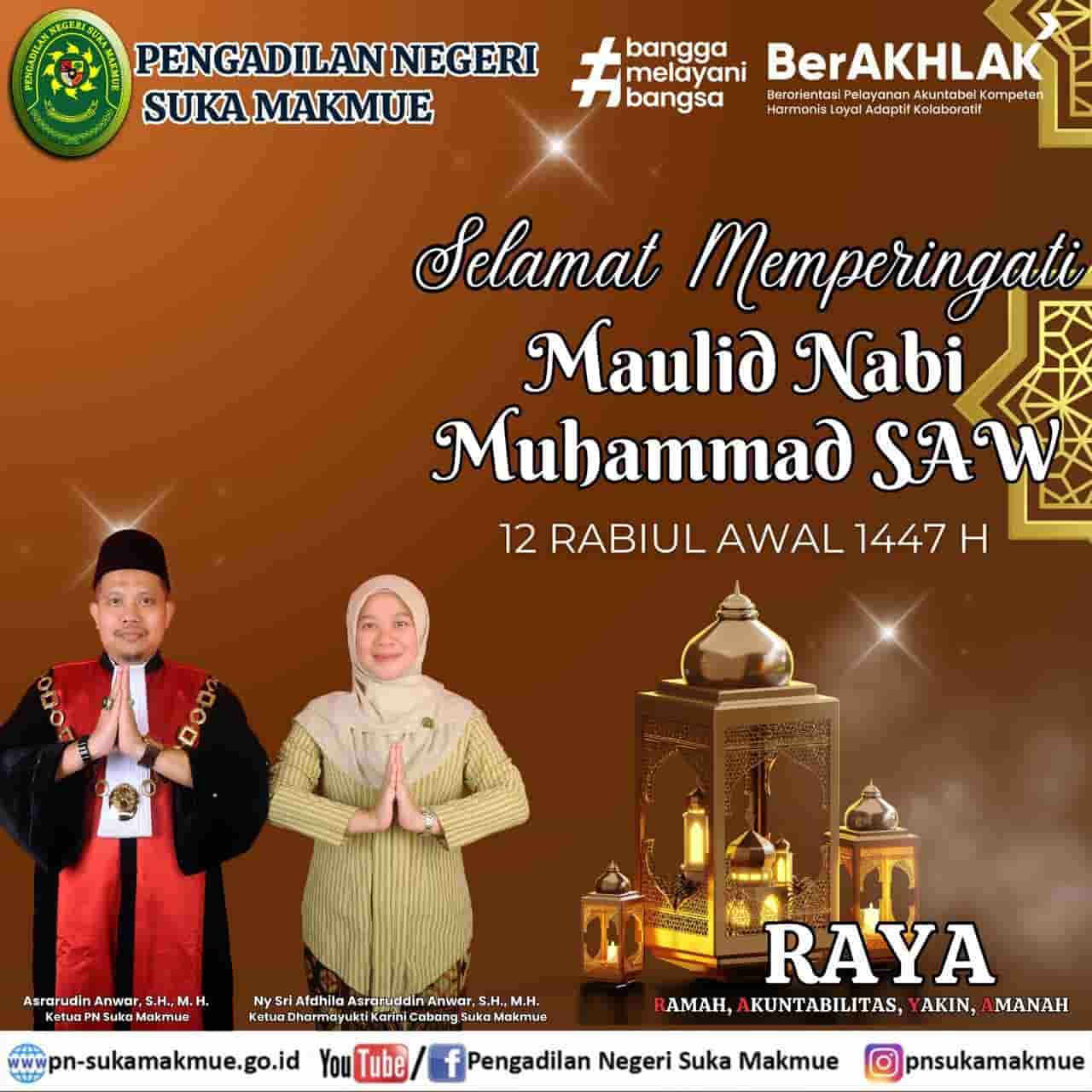 “Atas nama keluarga besar Pengadilan Negeri Suka Makmue, kami mengucapkan selamat memperingati Maulid Nabi Besar Muhammad SAW 12 Rabiul Awal 1447 Hijriah. Semoga teladan Rasulullah menjadi inspirasi dalam meningkatkan keimanan, ketaqwaan, serta pengabdian kita kepada bangsa dan negara,” ujar Asraruddin.